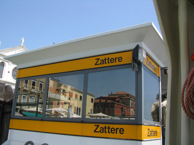 Cityscape reflections in vaporetto dock windows
